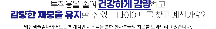 진정한 다이어트는 체중도 유지되어야 합니다. 맑은샘 슬림 다이어트는 편안하고 건강하게 유지 가능한 다이어트 노하우를 알려드립니다.